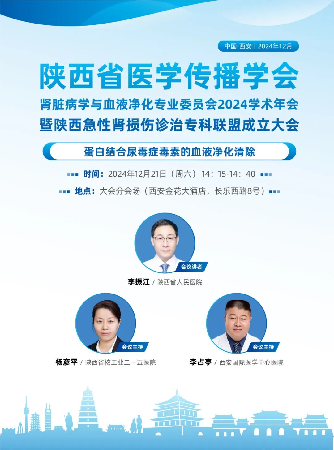 12月21日下午14:15-14:50在會(huì)議分會(huì)場(chǎng),陜西省人民醫(yī)院李振江教授將為大家主講《蛋白結(jié)合尿毒癥毒素的血液凈化清除》的專題報(bào)告,楊彥平教授李占亭教授擔(dān)任此次主持。