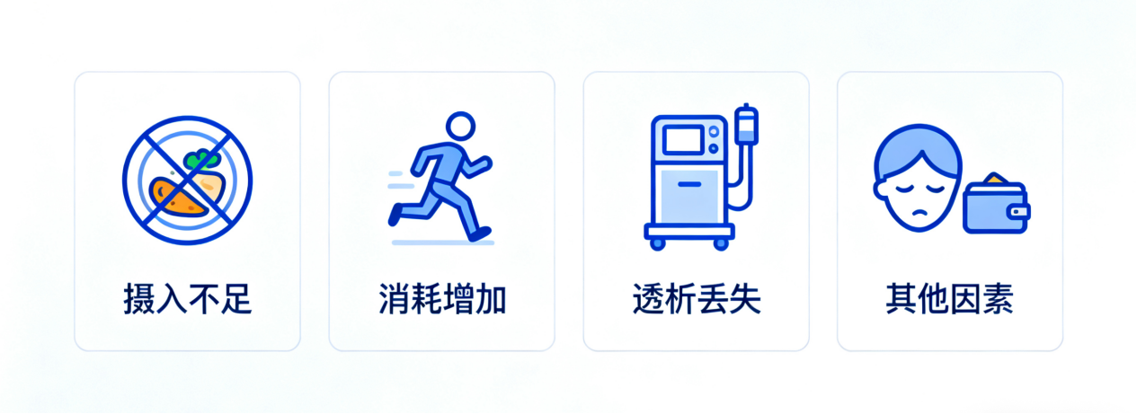 飲食限制是主要原因:為了控制血磷、血鉀和水腫,腎友需要嚴格限制高磷、高鉀食物以及水分的攝入。許多高蛋白食物(如奶制品、堅果、肉類本身)也同時富含磷和鉀,就導致優質蛋白和總熱量攝入不足。